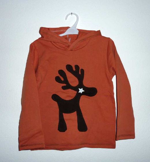 Kapuzenpulli für Knaben oder Mädchen mit RentierÄrmel aus KäferstoffOranger BaumwollsweatGrösse: 122/128 Preis: 45 Fr.ArtNr: SWK_1